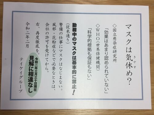 東京都庁ほか官庁など公共施設や工事現場の警備を担っている大手警備会社テイケイで働く警備員から、会社でマスクの着用を禁止され、新型コロナウイルス感染を心配しながら命がけで仕事をしている、といった深刻な相談が寄せられています。 毎週水曜日に「勤…