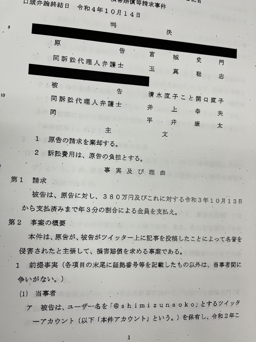 ■元組合員宮城史門(前田史門)氏がプレカリアートユニオン執行委員長の清水直子に対し損害賠償を請求した訴訟で、プレカリアートユニオン清水直子が勝利しました(11月18日・東京地裁で)