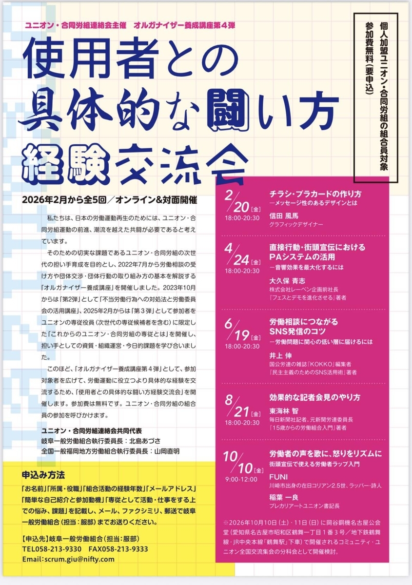 ・司会進行は、服部学(岐阜一般労働組合書記長)、稲葉一良(プレカリアートユニオン書記長)が担当します。